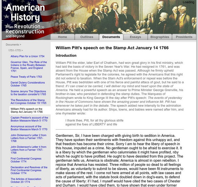 The original text of British Prime Minister William Pitt's actual speech to Parliament describing his disapproval of the Stamp Act and why he felt it should be repealed.
