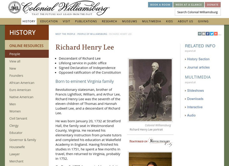 This is a brief, chronological history of the important events in the life of Richard Henry Lee. Provides good information and links.