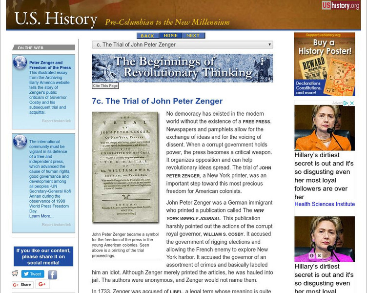 U.s. History: Beginnings of Revolutionary Thinking: Trial of John Peter Zenger