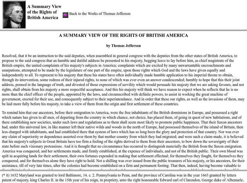 Written before the Declaration of Independence, this lengthy essay by Thomas Jefferson argued that the British Government was treating America unfairly. This site contains full text and footnotes within text hyperlinked to panel at...