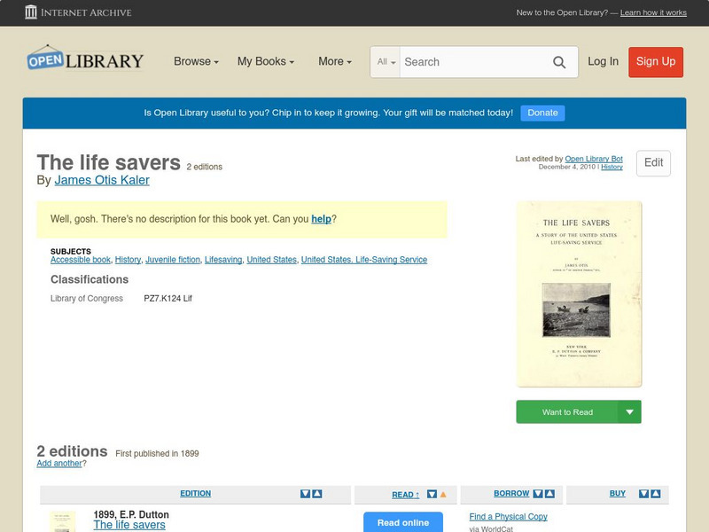 This ebook version of James Otis's The Life Savers has been made available in multiple formats by the Open Library. Editions of the full novel, organized by year of publication, may be accessed here.