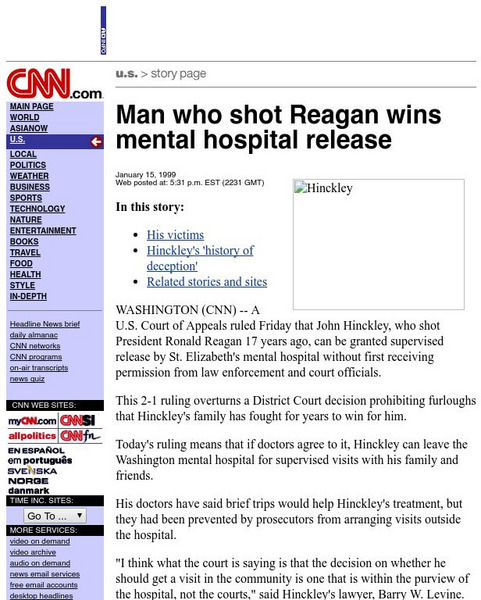 CNN article covering John Hinckley's supervised release from the mental hospital. Provides background material on the assasination attempt on Ronald Reagan.