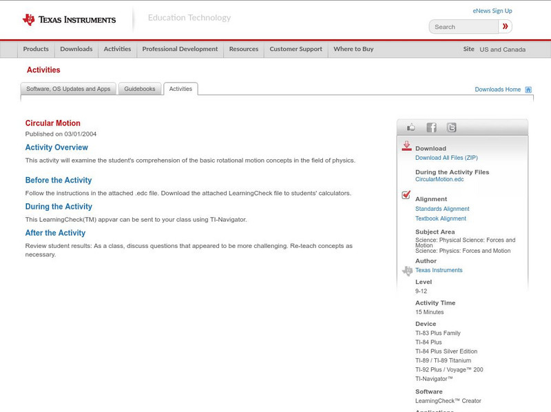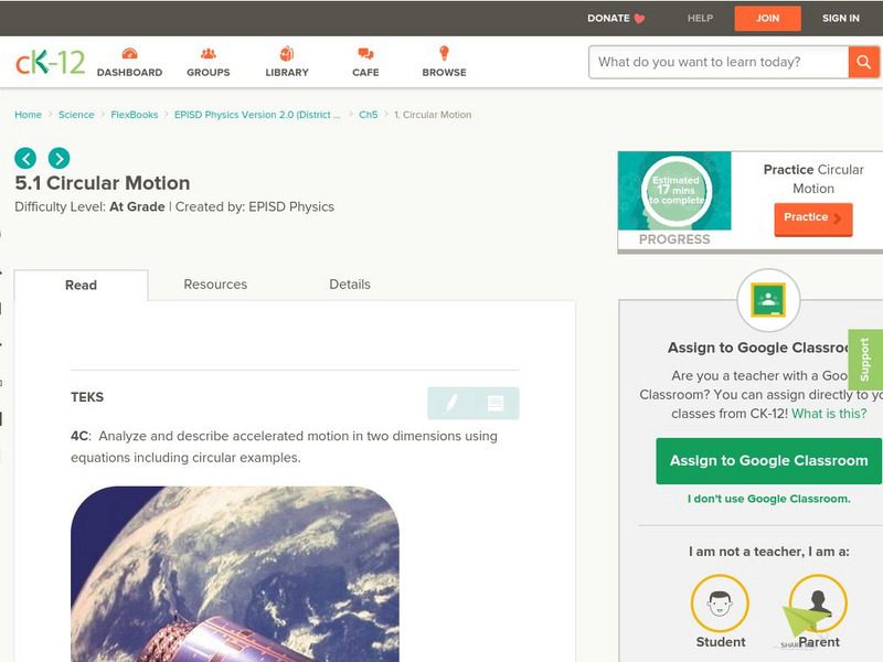 [Free Registration/Login may be required to access all resource tools.] In the following lesson students will be asked to analyze and describe accelerated motion in two dimensions using equations including circular examples.