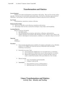 There are four activities in this extensive lesson covering the identity matrix and scaling, the linear representation of translations, the linear representation of rotations, and reflections. In small groups, they use the Cabri II...