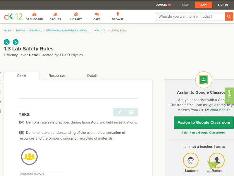 [Free Registration/Login may be required to access all resource tools.] Students explore and review safe practices during laboratory and field investigation in science.