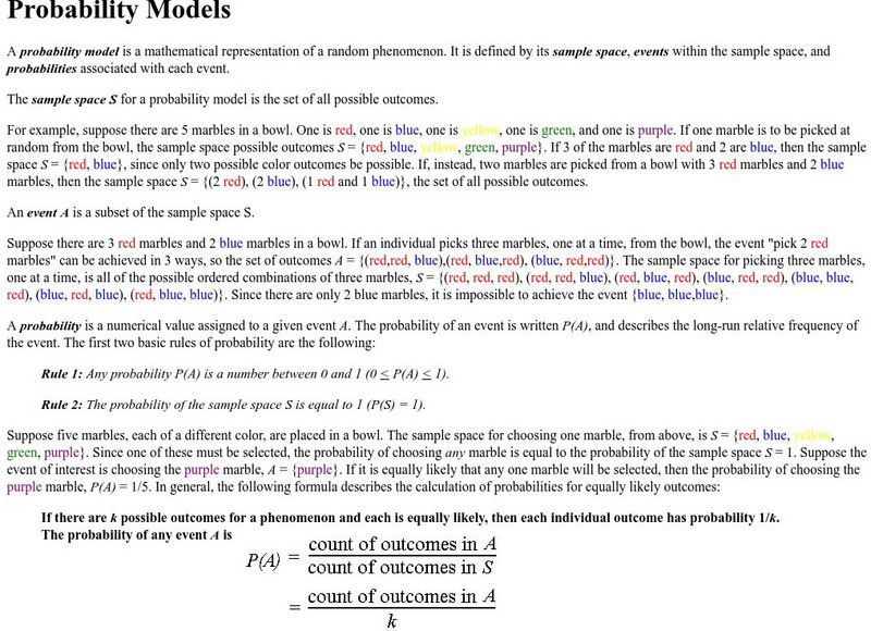 This site from Bowling Green State University provides an introduction to probability. It discusses topics and activities such as interpreting odds, listing all possible outcomes (the sample space), basic probability rules, equally...