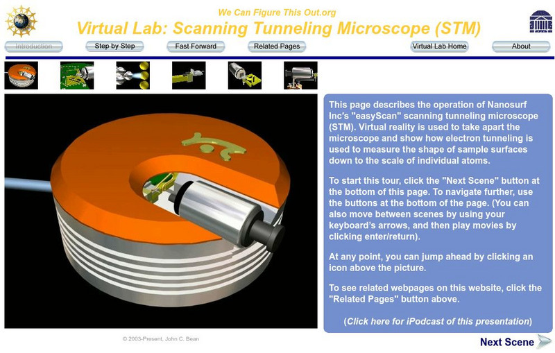 Find a description of the operation of Nanosurf Inc's "easyScan" scanning tunneling microscope (STM). Virtual reality is used to take apart the microscope and show how electron tunneling is used to measure the shape of sample surfaces...