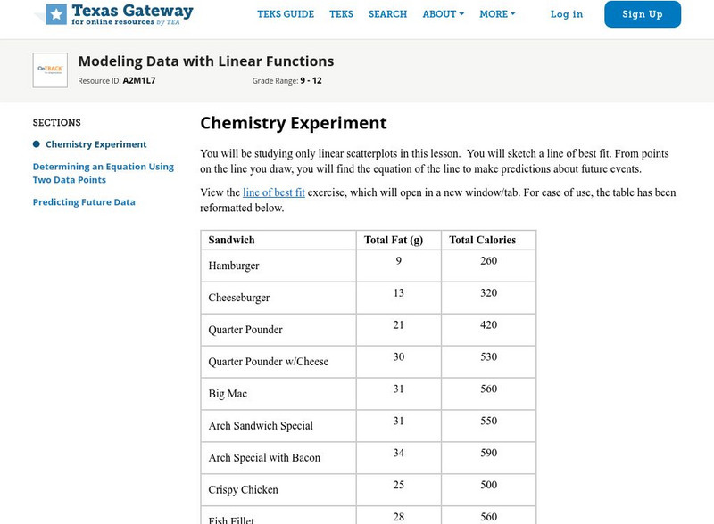[Free Registration/Login may be required to access all resource tools.] In this lesson students draw a scatter plot of data, find and draw the function that best fits that data, and make predictions from that information. Students watch...