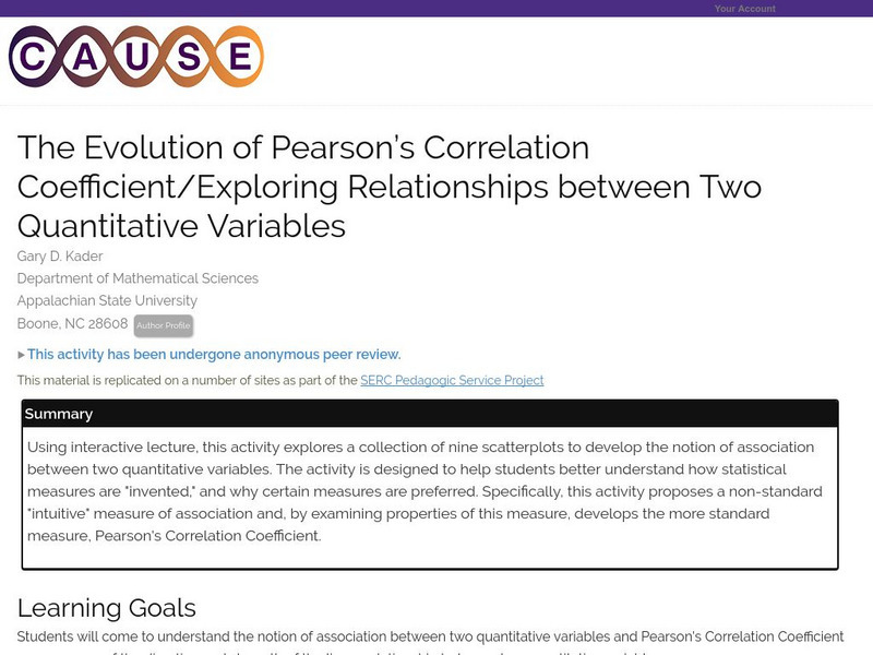 For this activity, students explore nine scatter plots to develop their understanding of how two quantitative variables are related. Through an exploration of the properties of this association, they come to understand the standard...
