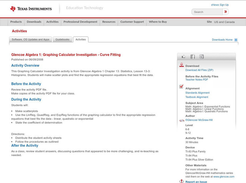 Texas Instruments: Glencoe Algebra 1: Graphing Calculator Investigation Curve