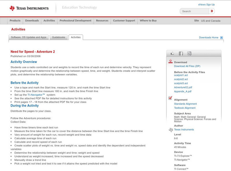 Students use a radio controlled car and weights to record the time of each run and determine velocity. They represent motion graphically and determine the relationship between speed, time, and weight. Students create and interpret...