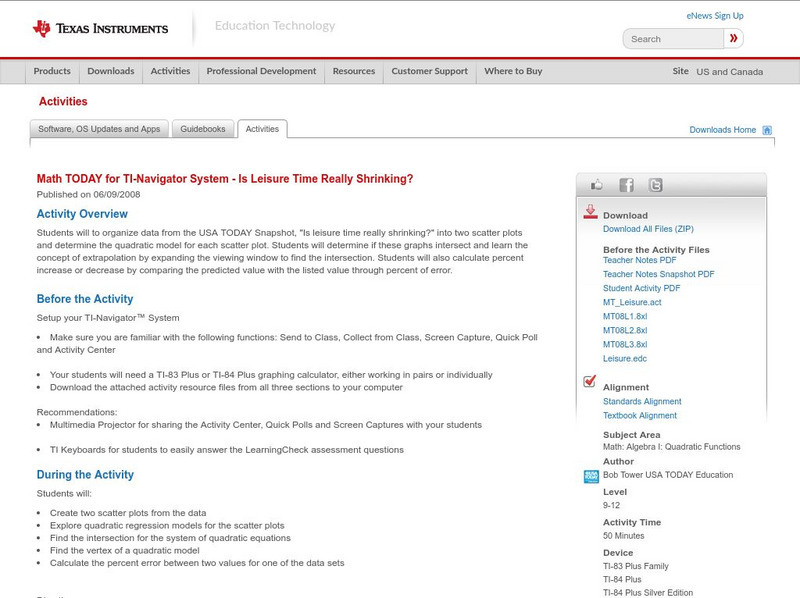 Students will to organize data from the USA TODAY Snapshot, "Is leisure time really shrinking?," into two scatter plots and determine the quadratic model for each scatter plot. Students will determine if these graphs intersect and learn...