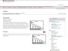 High schoolers collect height versus time data of a bouncing ball using the CBR 2™ data collection device. Using a quadratic equation they graph scatter plots, graph and interpret a quadratic function, apply the vertex form of a...