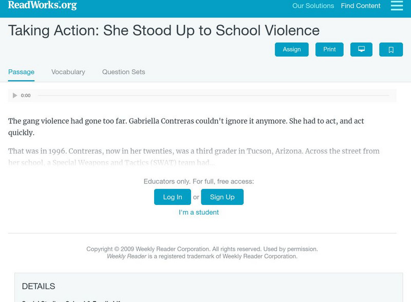 [Free Registration/Login Required] An informational text about a girl named Gabriella Contreras who stood up against school violence be creating a club called BADDD. A question sheet is available to help students build skills in reading...
