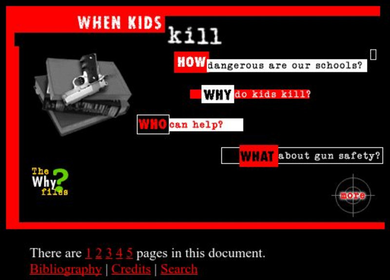 This Why? Files resource offers information and resources on school violence issues entitled "When Kids Kill."