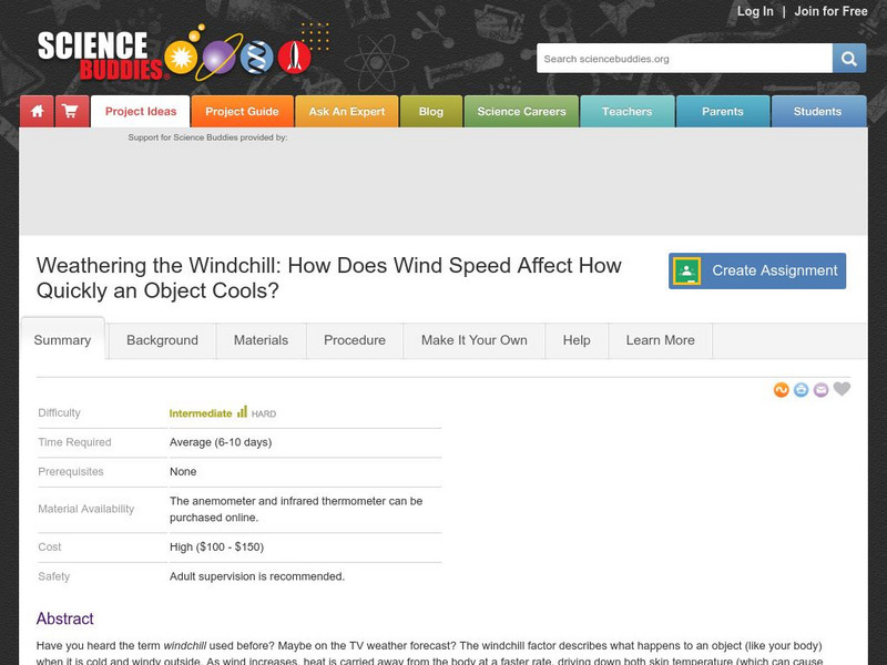 With this science fair project measure the effect of wind speed on how quickly an object cools. The Science Buddies project ideas are set up consistently beginning with an abstract, objective, and introduction, followed by a section on...