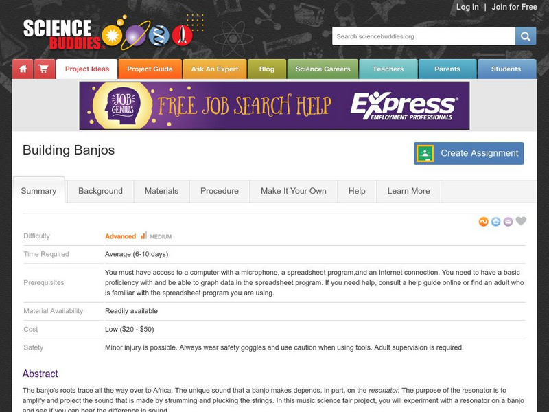 It is said that you can't play sad music on a banjo. Following the instructions for this science fair project, you can make your own rough banjo and see effect the resonator has on the sound. The Science Buddies project ideas are set up...