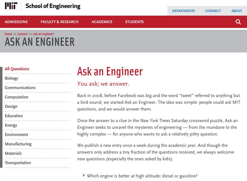 This resource is composed of student questions for engineers, and provides information on a variety of scientific topics such as devising science fair projects, planning scientific experiments and getting into a school like MIT for...