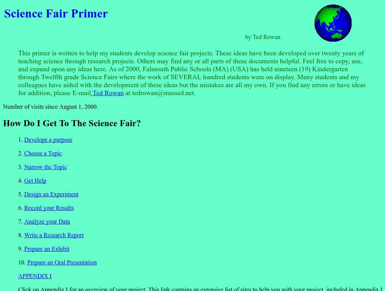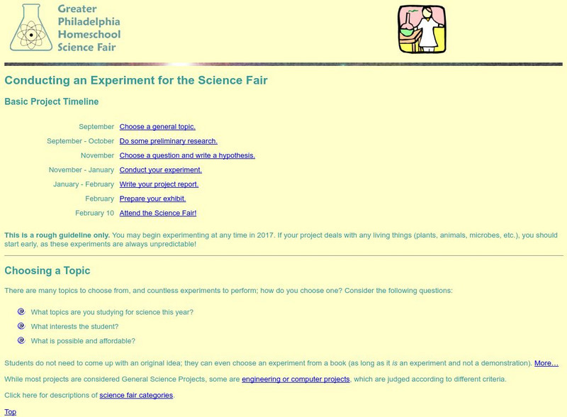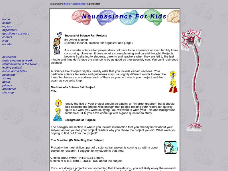 This competent site features a thorough and detailed description of the steps needed to produce a successful science fair project. Other helpful science fair web pages can be found on this site.