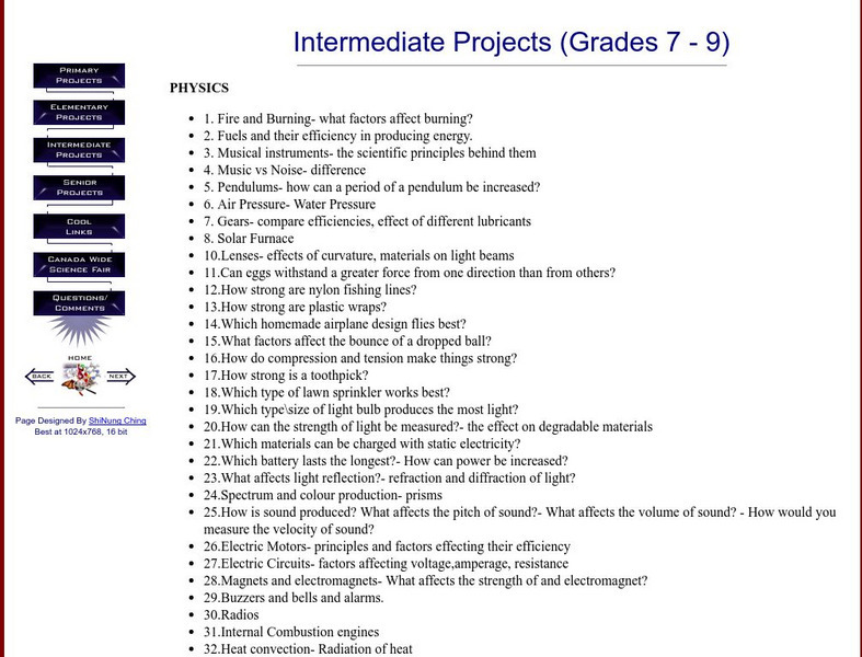 This site from the Center for Distance Learning and Innovation provides a really extensive listing of possible science fair projects. Maybe a hundred. Physics, Engineering, Meteorology, Chemistry, Botany. Interesting goodies.
