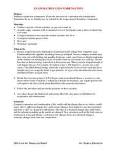 Young scholars explore how temperature effects the processes of evaporation and condensation and how the air may be polluted by the evaporation of certain compounds. In this temperature lesson students complete a lab and a...