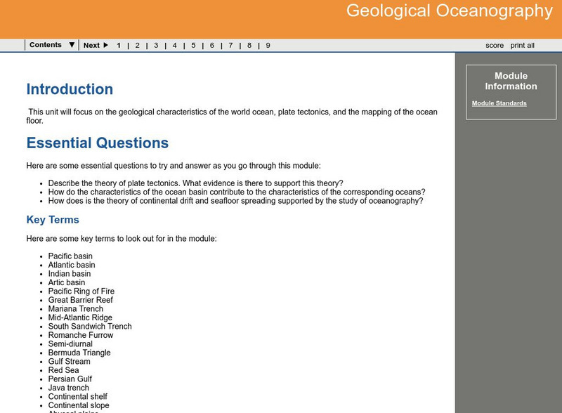 This unit will focus on the geological characteristics of the world ocean, plate tectonics, and the mapping of the ocean floor.
