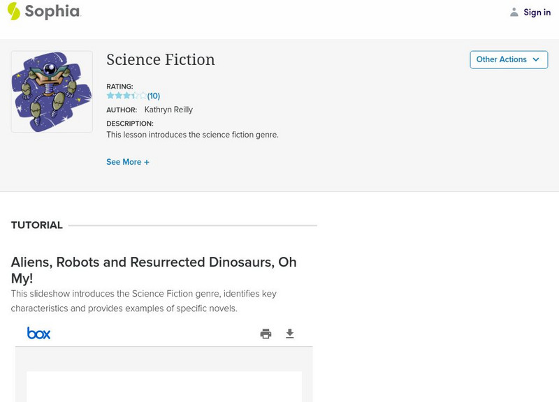 This slideshow introduces the genre of science fiction. It presents background information, common elements, common themes, pop movies (from books) showing diverse examples, and three specific examples: "Time Machine," "I, Robot," and...