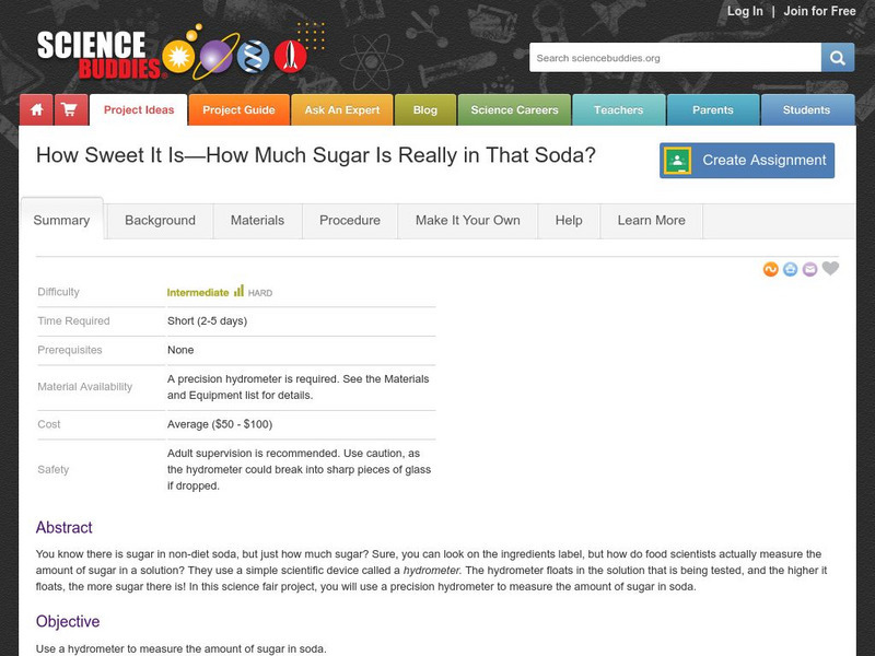 In this science fair project, use a precision hydrometer to measure the amount of sugar in soda. The Science Buddies project ideas are set up consistently beginning with an abstract, objective, and introduction, followed by a section on...