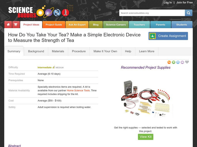 In this science fair project, measure the strength of tea, using plastic cups, a photoresistor, and a multimeter. The Science Buddies project ideas are set up consistently beginning with an abstract, objective, and introduction, followed...