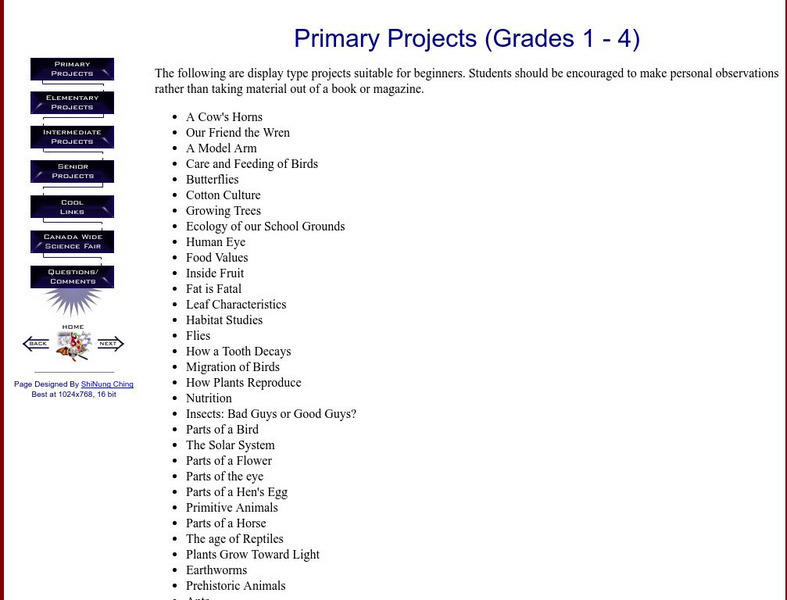 At this site from the Center for Distance Learning and Innovation there's a monstrous listing of possible science fair projects. You can choose from primary (grades 1-4), elementary (grades 4-6), intermediate (grades 7-9), or senior...