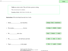 In this verb activity, students read a definition of verb, then correctly complete sentences by choosing a verb from a choice of three given at the end of each sentence.