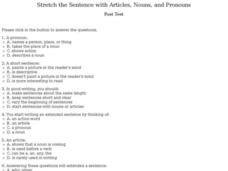 In this stretch the sentence with articles, nouns and pronouns learning exercise, students interactively answer 10 multiple choice questions about sentence writing, then click to check their answers.