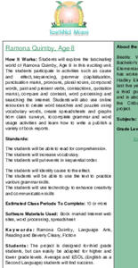 Third graders read Beverly Cleary's book "Ramona Quimby, Age 8" and then complete a series of extension activities. Students explore cause and effect, sequencing, related websites, grammar lessons and comparison skills.