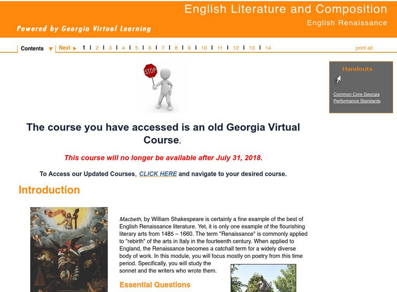 This is an introduction to the English Renaissance, a rebirth of the arts including the literary arts from 1485 to 1660. The essential questions for the unit focus on how the events of the period influence the writing of the carpe diem...