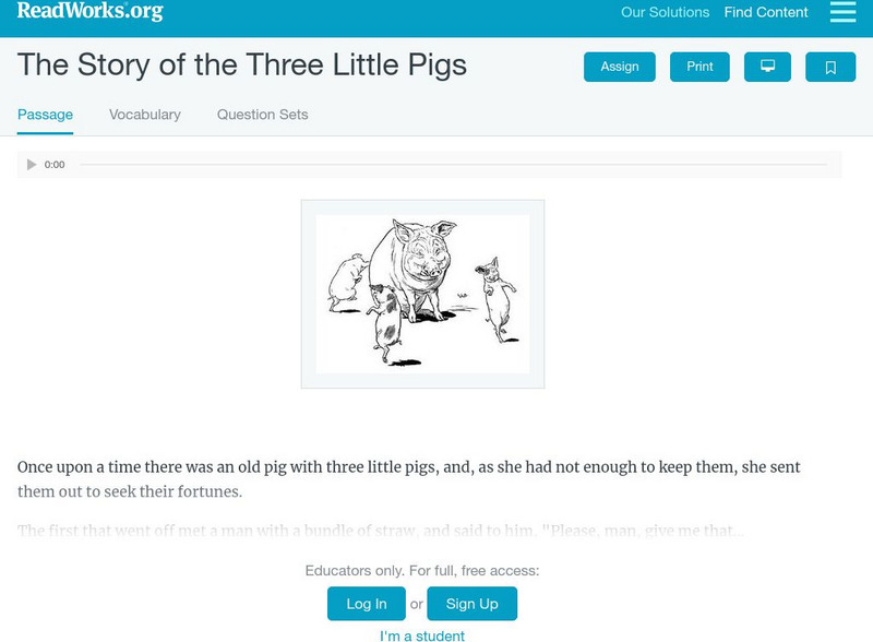 [Free Registration/Login Required] This short literary text passage shares the fairy tale of the Three Little Pigs. This passage is intended for guided practice and is designed to reinforce essential reading comprehension skills.