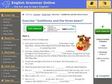 In this simple present tense worksheet, learners use fill in blanks in the story "Goldilocks and the Three Bears" with simple past tense verbs. ESL appropriate but not exclusive.