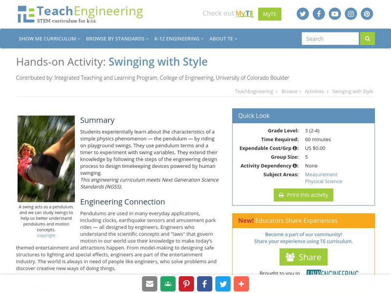 Students experientially learn about the characteristics of a simple physics phenomenon - the pendulum - by riding on playground swings. They use pendulum terms and a timer to experiment with swing variables. They extend their knowledge...