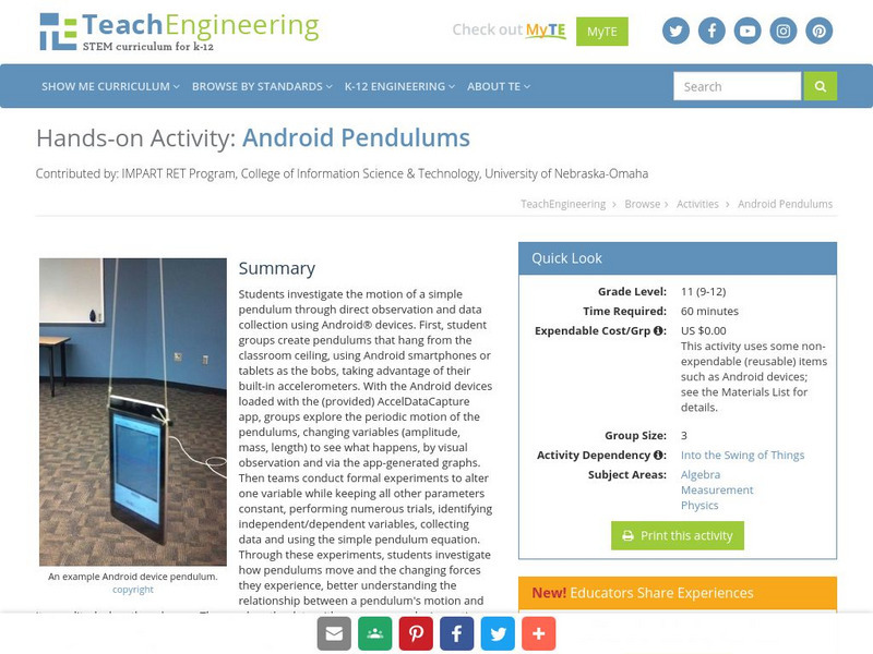 In this physics lab activity students investigate how mass, length and angular displacement affect the period of a simple pendulum. Students control variables, testing one variable at a time, using manual techniques (stopwatch, human...