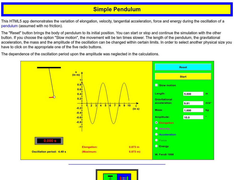 This app demonstrates how elongation, velocity, tangential acceleration, force, and energy are affected when a pendulum oscillates.