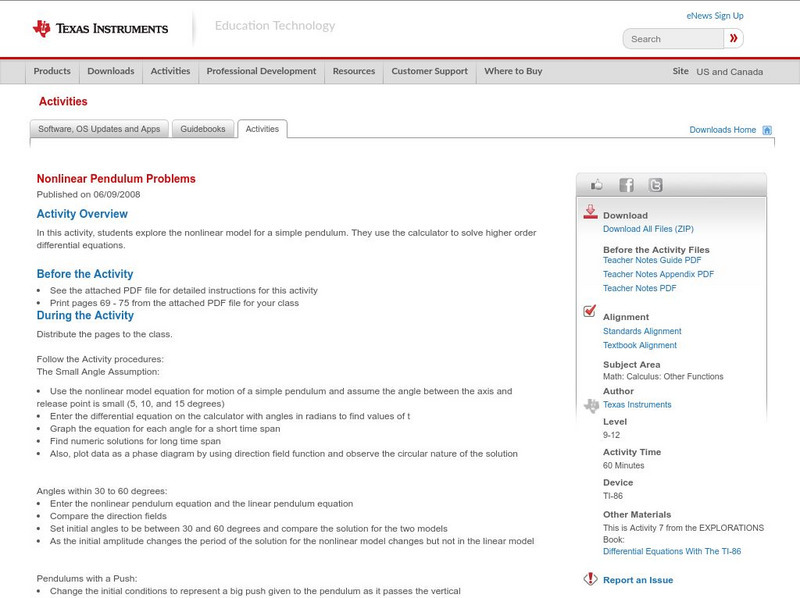 In this activity, students explore the nonlinear model for a simple pendulum. They use the calculator to solve higher order differential equations.