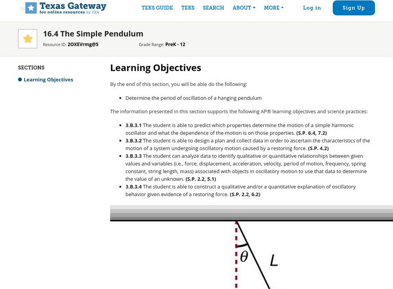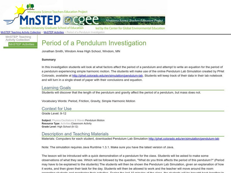 Experiment with a pendulum to see what happens to the oscillation when you change the mass, gravity, or damping. Students can also change the starting position. Site includes equations to help students understand what is happening in the...