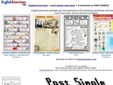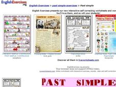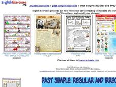 An interactive online activity for practicing simple past tense verb forms features cute pictures, and offers a decent challenge with three exercises. First, learners choose the correct form of a verb from a drop-down menu to complete...