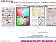 In this present simple verb online worksheet, students use drop down menus to choose the correct verb to complete 5 sentences. They complete 9 sentences with the proper verb, and then write the sentences using the negative form. They...
