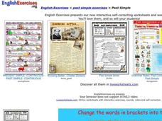 In this past simple verb tense online worksheet, students unscramble verbs and place the past simple form in each of 20 sentences. They match 8 sentences to the clip art pictures and write the sentence number in the box. They submit the...