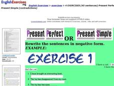 Your English learners, or young native speakers, can practice converting affirmative sentences into negative ones using various verb forms. Forty-five opportunities are provided. Page contains links to additional resources and audio...