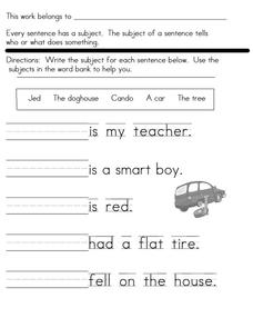 For this sentence worksheet, students read about the subject of a sentence, then fill in blanks to correctly complete a set of 5 simple sentence.