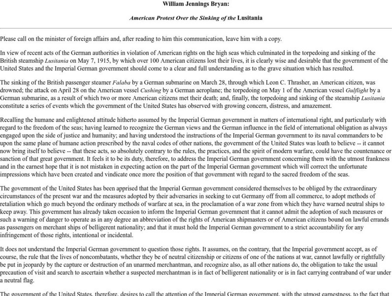 This site contains the first Lusitania note sent to Germany by President Woodrow Wilson, under the signature of Secretary of State William Jennings Bryan, May 13, 1915.