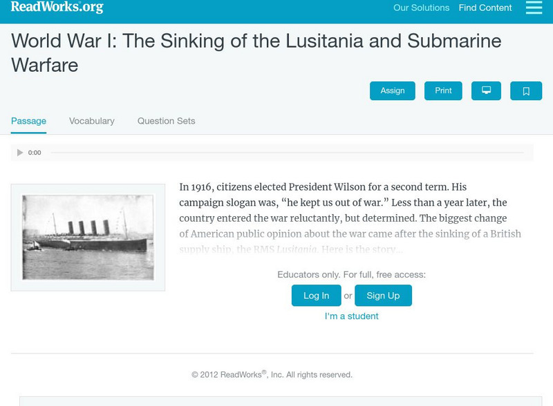 Read Works: World War I the Sinking of the Lusitania and Submarine Warfare