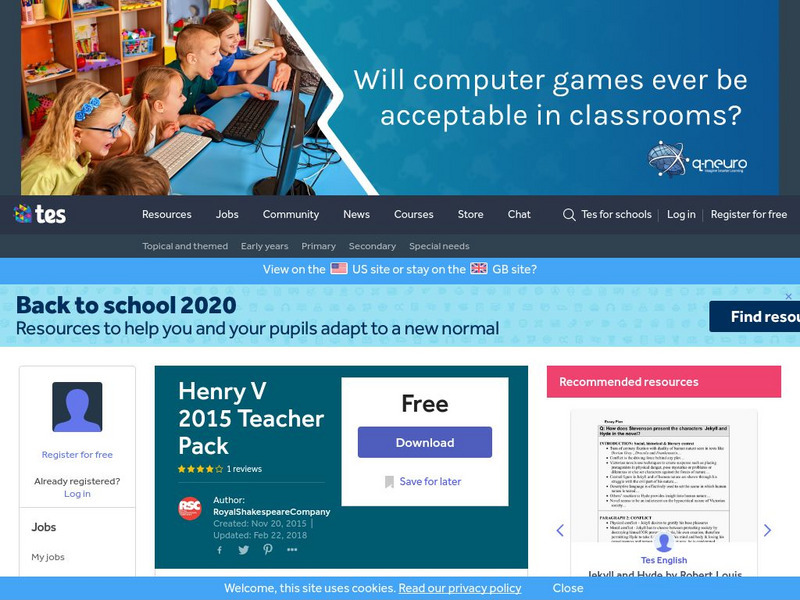 [Free Registration/Login Required] This is a teacher resource for Shakespeare's Henry V from the Royal Shakespeare Company. It is divided into six sections: Imagining the Story, Two Kingdoms, Leadership in War, Band of Brothers, A Royal...