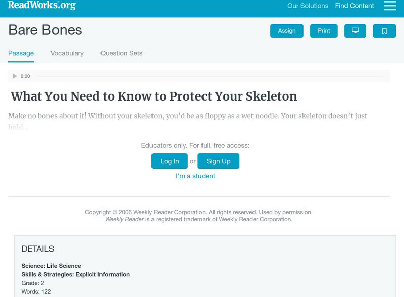 [Free Registration/Login Required] An informational text about the skeletal system and a diagram showing some of the bones. A question sheet is available to help students build skills in reading comprehension.